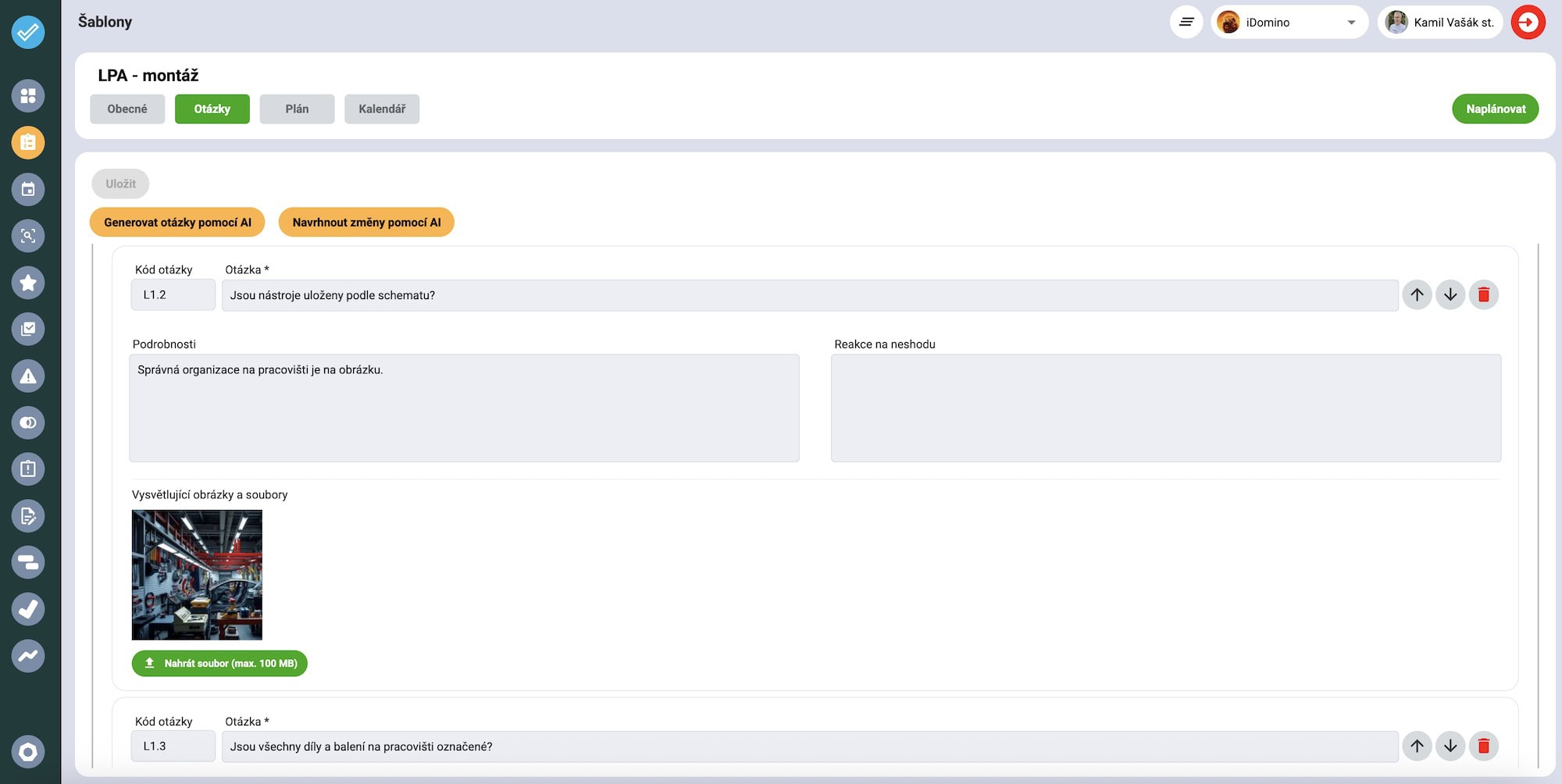 Nastavuje text jednotlivých otázek auditu nebo si může otázky auditu importovat ze svého excelového souboru. Případně si může nechat pomoci AI s generováním otázek podle příslušné normy.