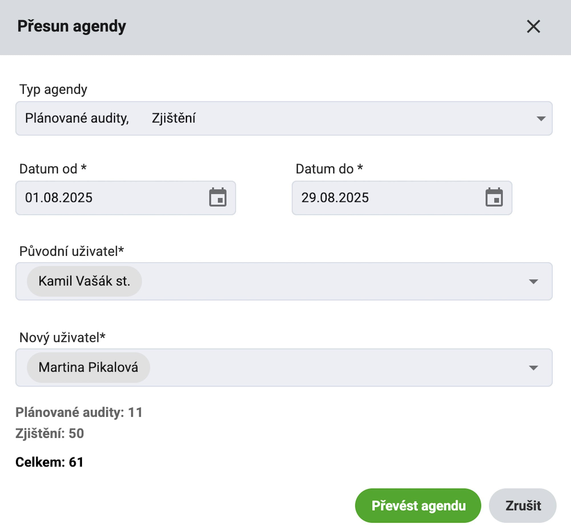 Pomocí přesunu agendy můžete přenést úkoly jednoho uživatele na více jiných uživatelů.