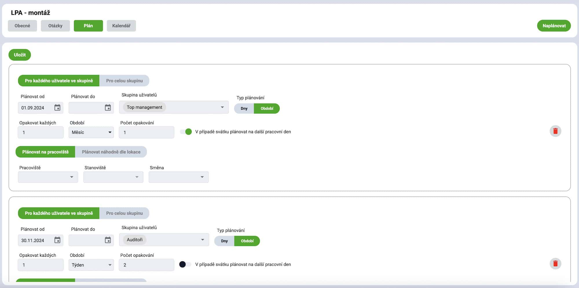 Ke každé šabloně auditu lze nastavit generování auditů do kalendářů uživatelů a to ve úrovních, např. jinak pro auditory z provozu a jinak pro členy managementu.