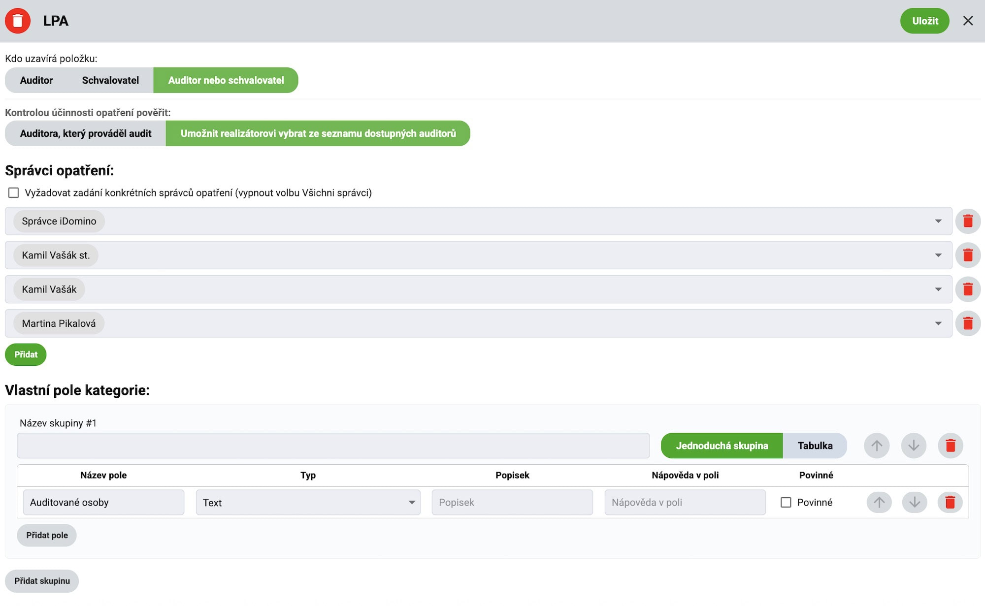 Nastavení pravidel provádění auditu, nastavitelná vlastní pole