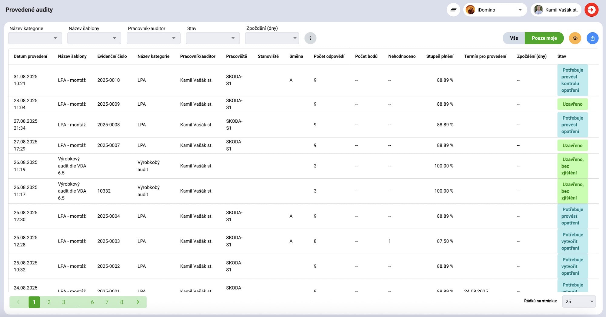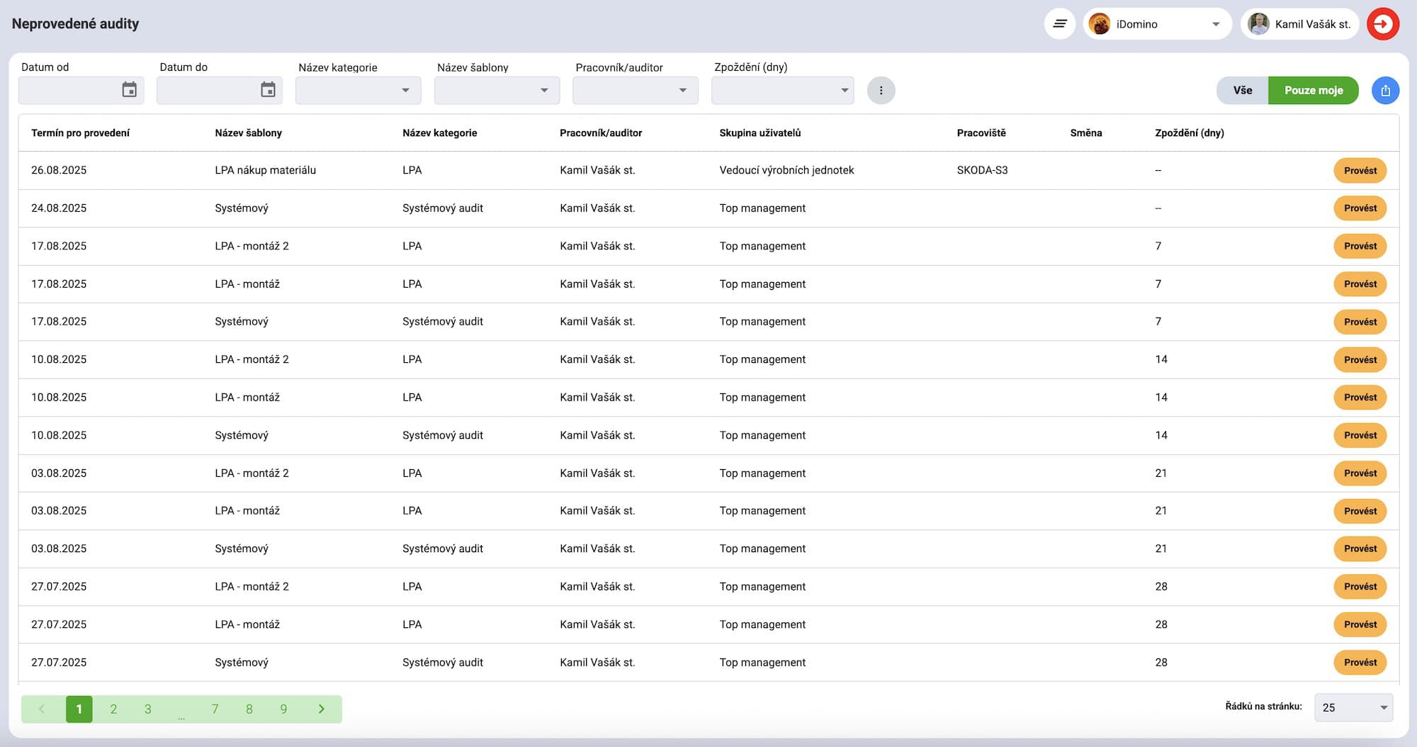 Sestavu provedených auditů si můžete filtrovat podle potřeb, vidíte zpoždění v auditech, sestavu můžete exportovat do excelu.