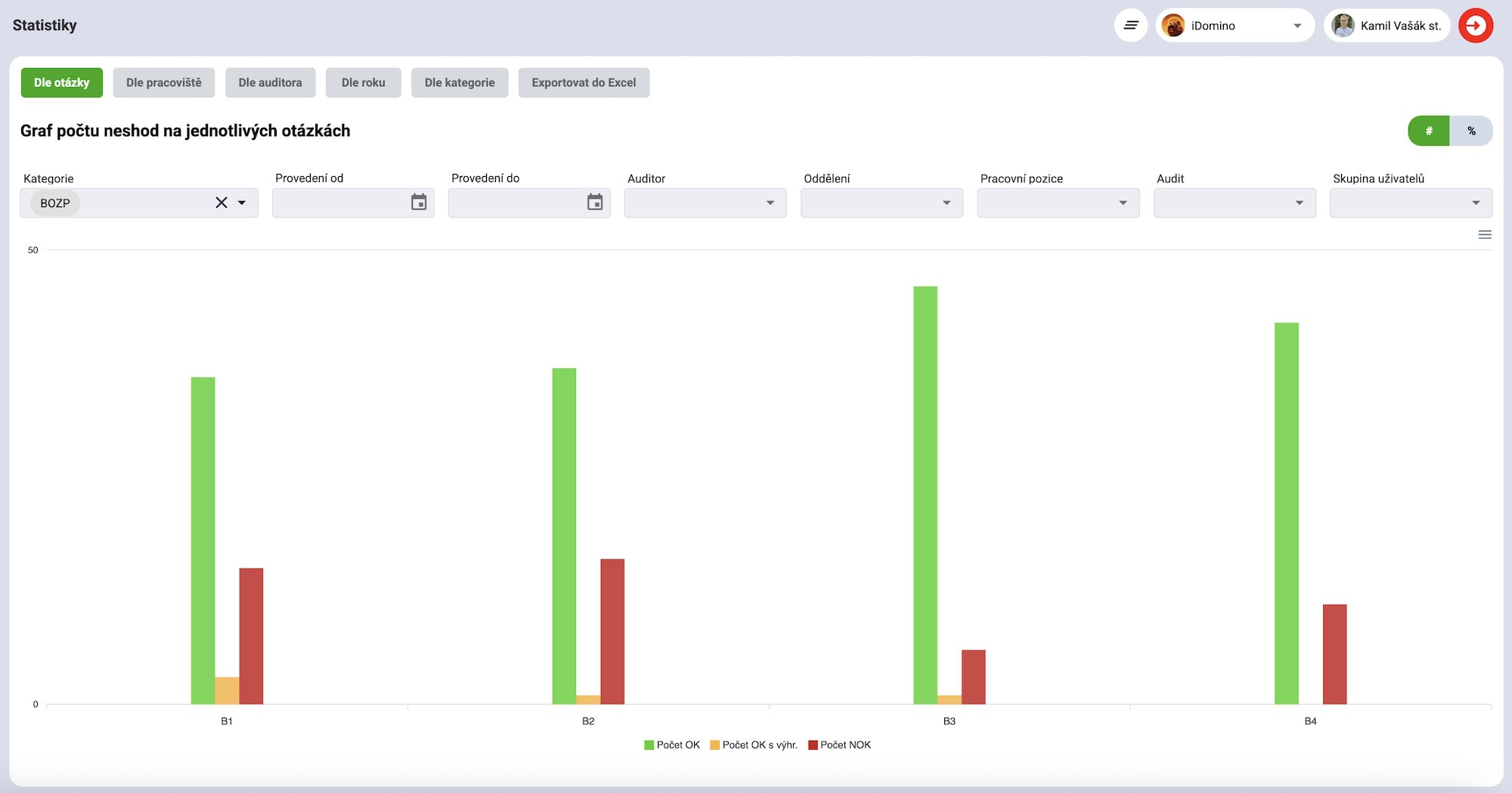 Oprávněný uživatel mák dispozici grafy z auditů v různých pohledech s možností filtrování. Dále je k dispozici export dat v excel formátu vhodném k dalším analýzám, např. Pomocí Power BI.