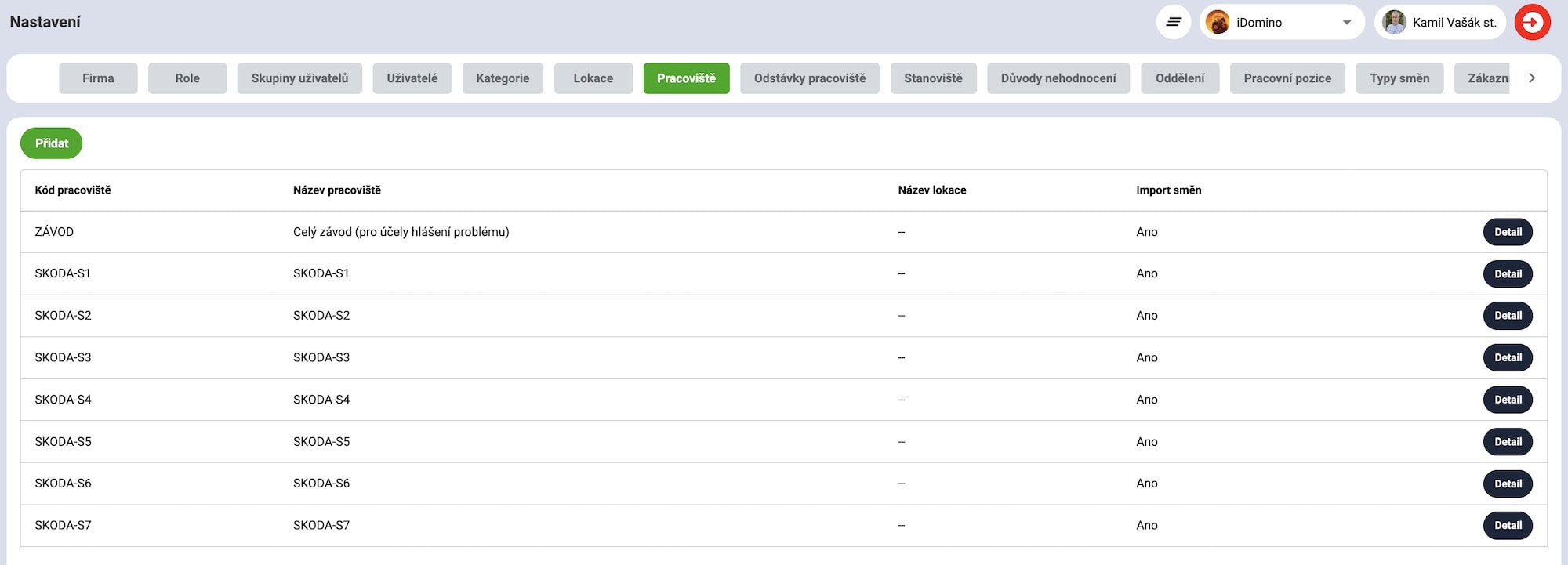 Aplikace obsahuje nastavitelné číselníky pracovišť, víceúrovňových lokací, např. provozů, stanovišť, směn, důvodů nehodnocení a další.